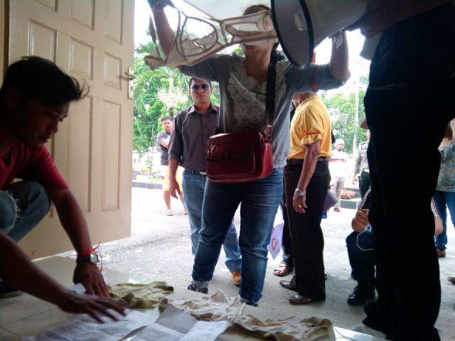 Hal yang lebih mengejutkan adalah para massa aksi memberikan sebuah kado istimewa kepada DPRD Siantar berupa BH dan Kolor bekas busuk.