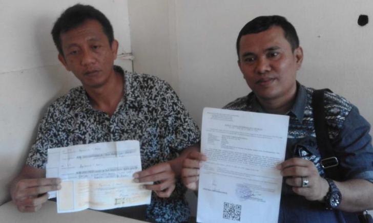 Foto: MENUNJUKKAN PENGADUAN: Agustinus Barus (kiri) didampingi penasehat hukumnya menunjukkan kwitansi pembayaran dan laporan pengaduan yang diterima petugas kepolisian saat dimintai tanggapan rekan wartawan di Polres Pematangsiantar, Kamis (24/5).