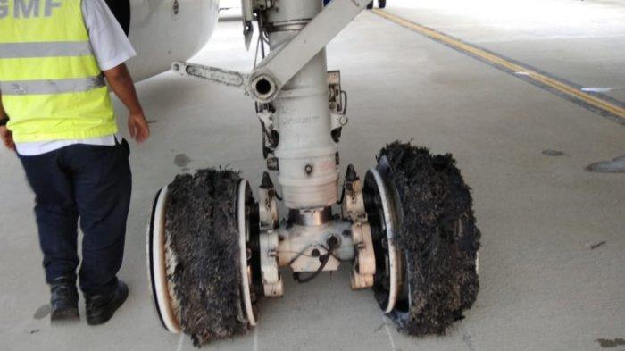 Foto: Kondisi ban pecah pesawat Garuda saat mendarat di Bandara Kualanamu, Deliserdang, Senin (11/6/2018)